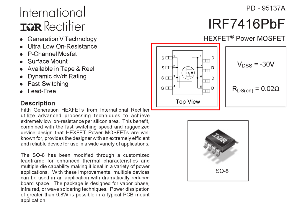 恩山的方案是短路这个电阻,但是这需要一定的焊接,而且也不便使用,根据观察可以发现左侧SOP-8封装的器件为 IRF7416PbF 功率MOSFET,封装如下: