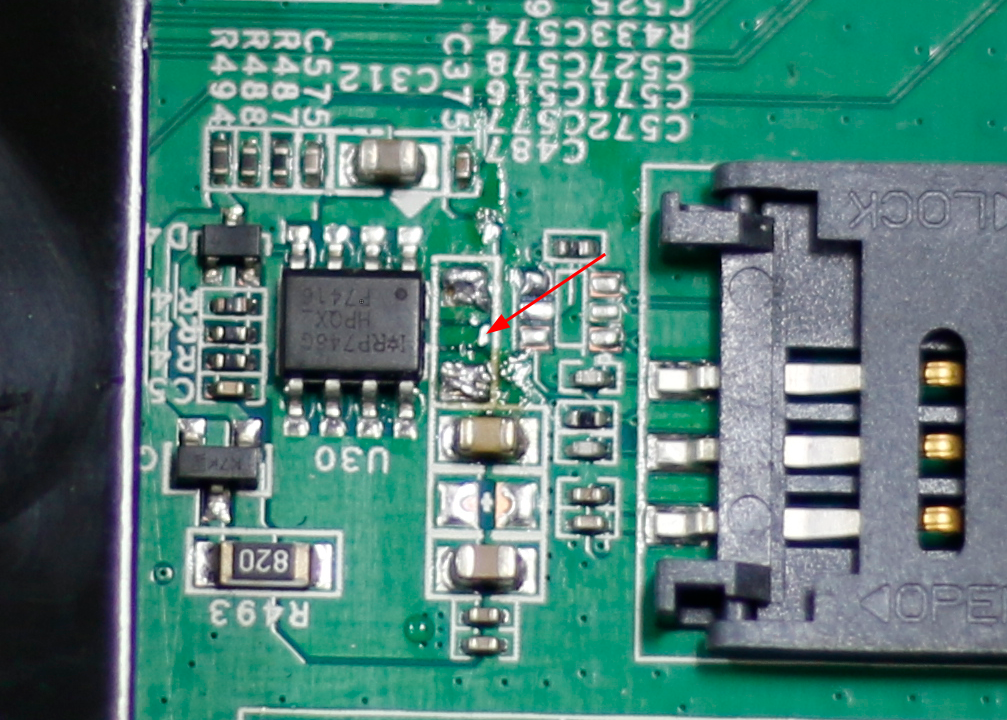 这个MOSFET的源极和漏极接在整板3.3V与miniPCIe的供电3.3V中间,我们可以推断该MOSFET的用途是miniPCIe的供电控制,那么栅极推断应为SoC GPIO控制。